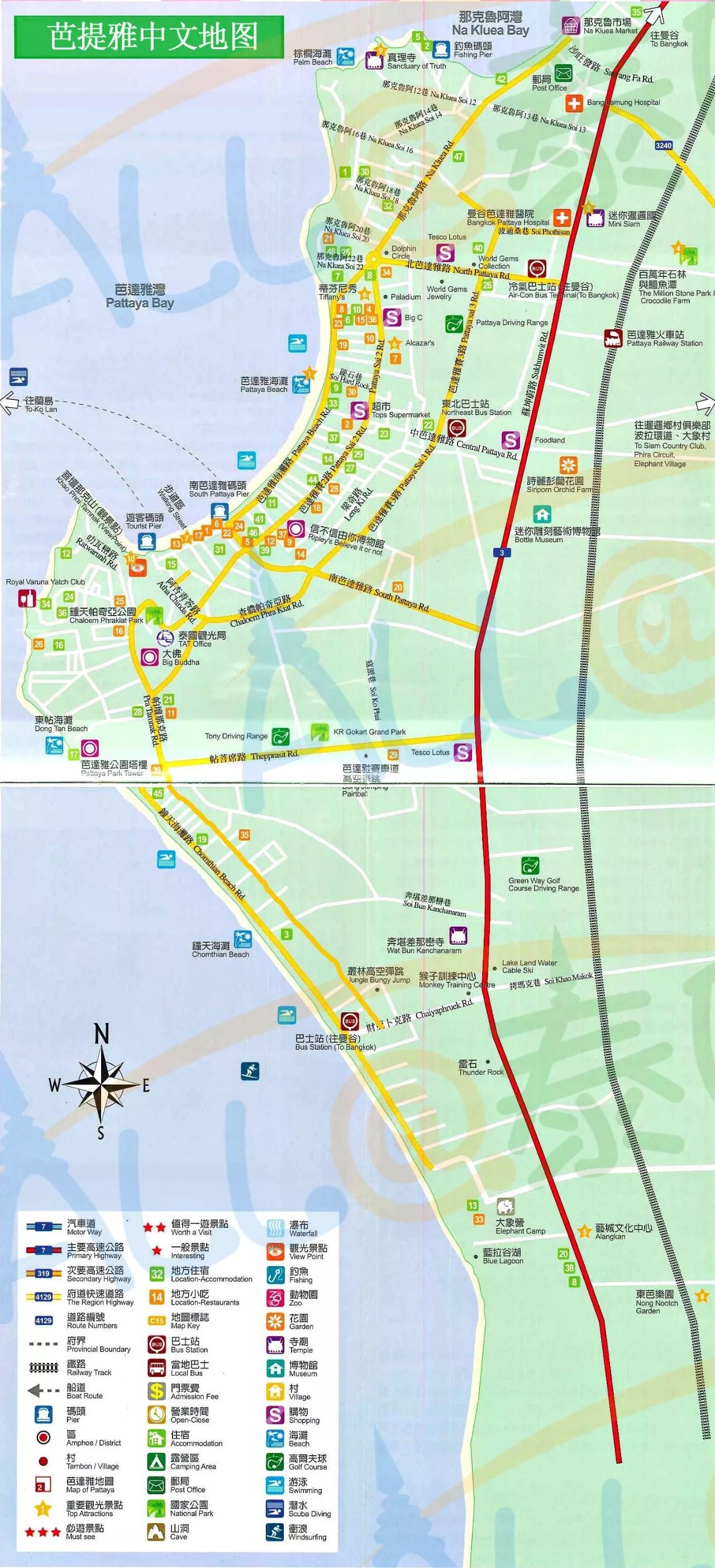 从曼谷过来的高速路素坤逸路 Sukhumvit Road(地图中红色线)把芭提雅分成东、西两部分。我们一般说起到芭提雅旅游、度假、养老,基本指的都是西芭提雅区域。道理很简单,所有滨海城市,都是沿海岸线发展,芭提雅也不例外。芭提雅的城市核心部分都在西区。而西区的土地价值自然也比东芭提雅高出很多,整体来说,在芭提雅,越往东,土地越不值钱。