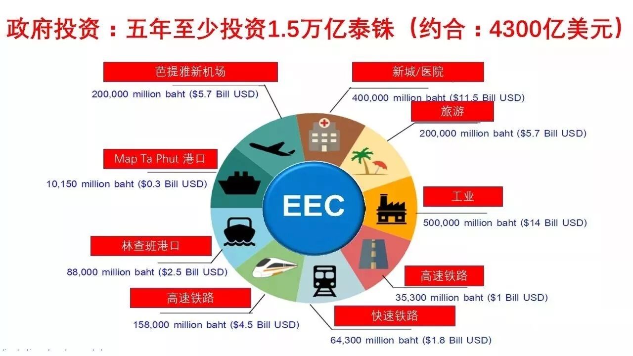 EEC泰国东部经济走廊,在未来5年(2017年—2021年)内,支持经济项目101个,总投资额超过3420亿泰铢。目标在2021年实现国内生产总值GDP增长4%,至2026年,GDP增长达到4.9%。